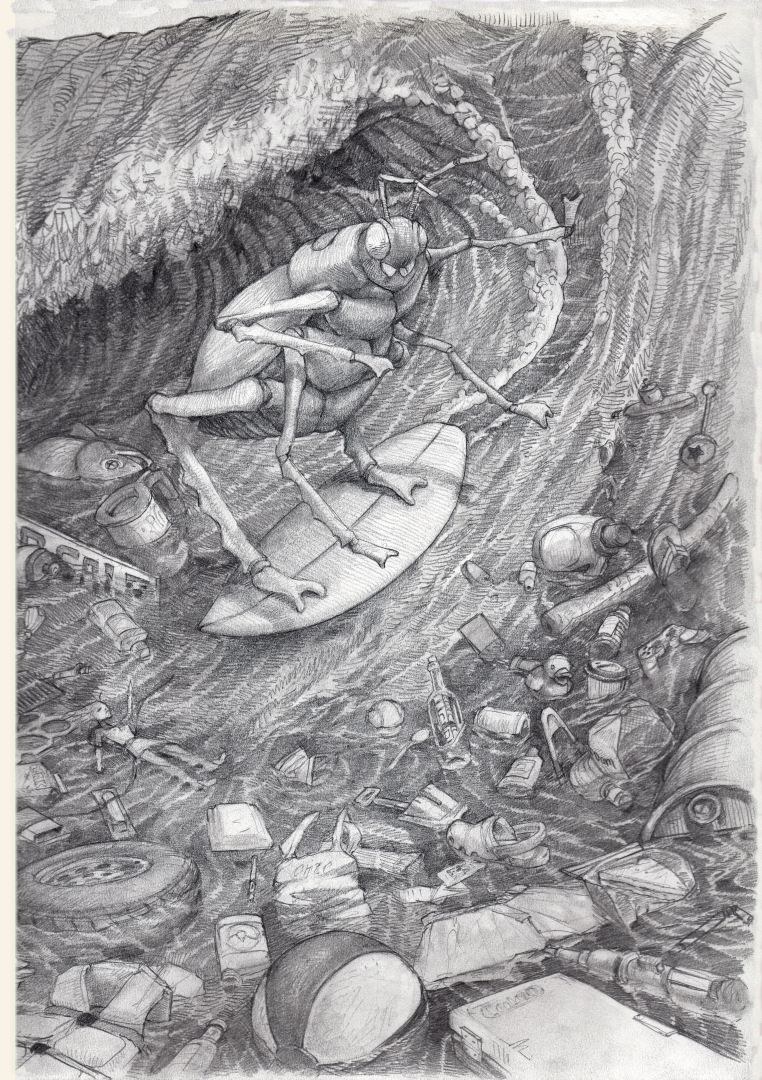 a Roach, surfing a wave.